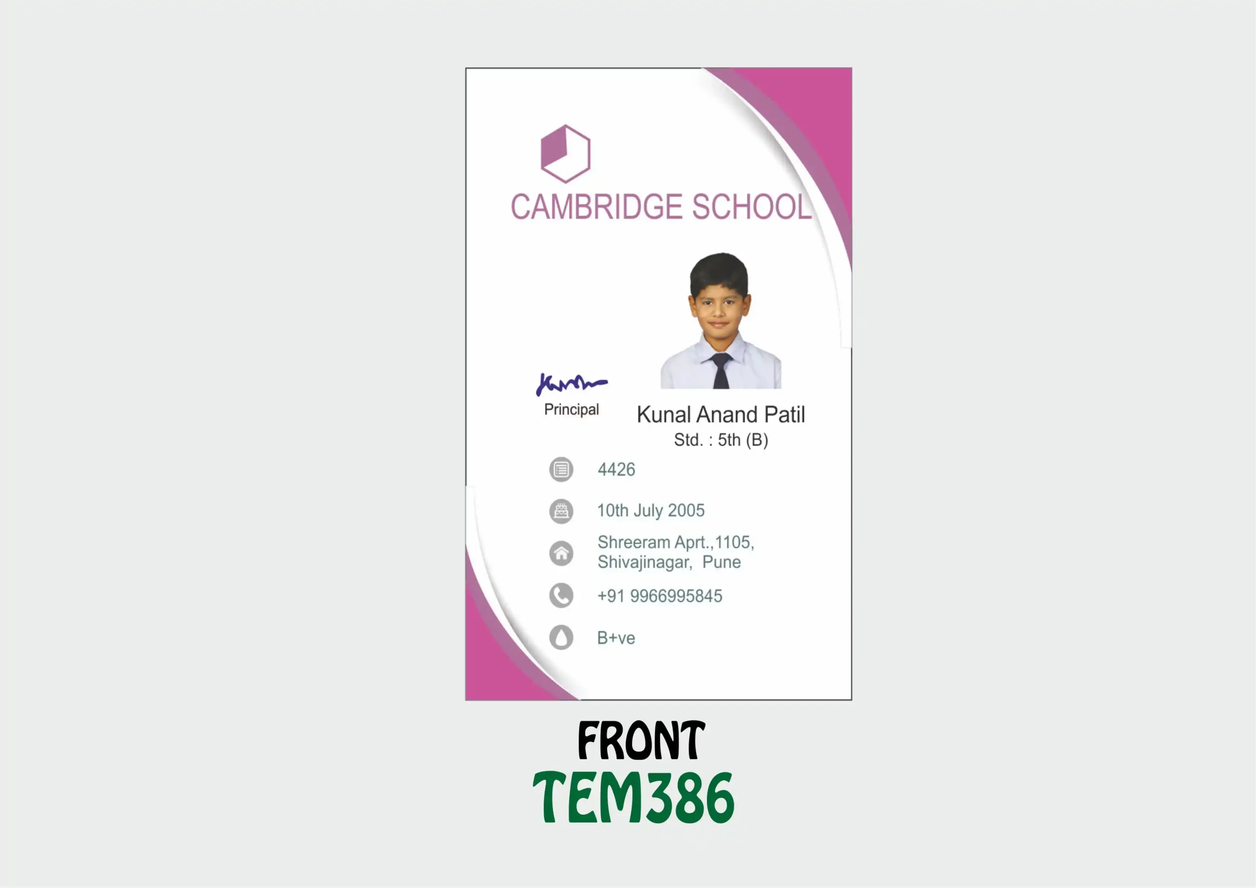 Easy to Edit: Name, Photo, ID No., Class, Designation, Address, Mobile No.